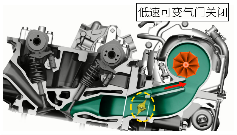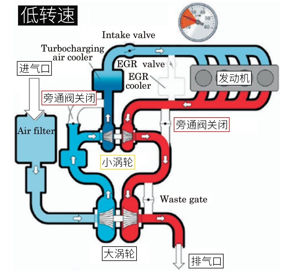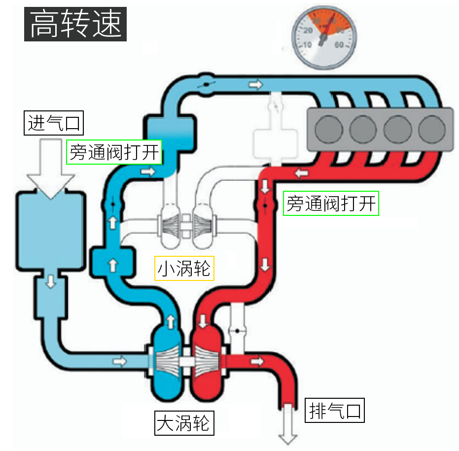 在低转速行驶时,由于发动机的排气量较小,所以如上图所示,ECU会关闭进排气端的旁通阀,使废气优先带动小号涡轮来增压。此时,由于小涡轮的惯性低,所以涡轮的迟滞就会更小,可以帮助车辆在低速获得强劲动力的同时,还能保证动力的响应速度。