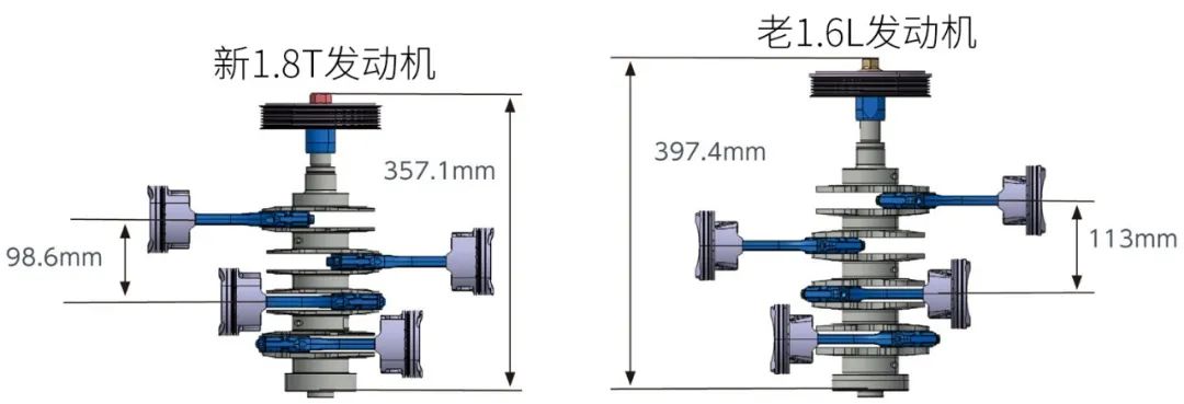 除了气缸更偏向长行程外,全新1.8T发动机每个气缸之间的间距还从老款1.6T的113mm,缩短到了98.6mm,最终使全新1.8T发动机的长度,相比老款1.6T还缩短了40.3mm,并且重量也降低了14.6kg。而更短的发动机,也意味着发动机在机舱内的位置会更靠后,加上更轻的重量,所以这台1.8T发动机的重心也会更靠后,可以帮助车辆实现更均衡的前后配重,进一步提升车辆的动态表现。