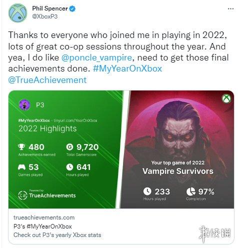 Xbox负责人 菲尔·斯宾塞 今日分享了他自己的2022年Xbox游戏年度报告,今年他一共玩过53款游戏,总时长641小时(平均每天玩2小时左右),最喜欢的游戏是《吸血鬼幸存者》,占据了223个小时,并获得了该游戏97%的成就。