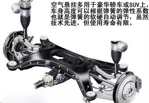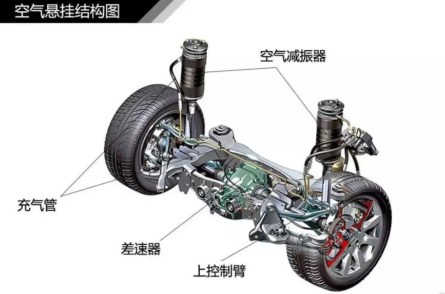 空气悬挂指的是,在螺旋弹簧外面加装一个气囊或内部建立一个气室。通过调节减震气囊或气室内的气体,起到改变减震状态、稳定车身水平的作用。