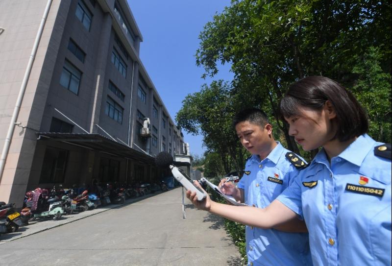 新华社照片, 6月14日,杭州市生态环境局临安分局的工作人员用专业设备在检测厂区的环境噪声。