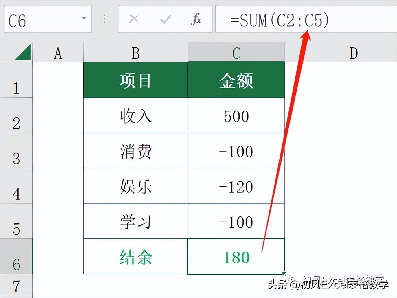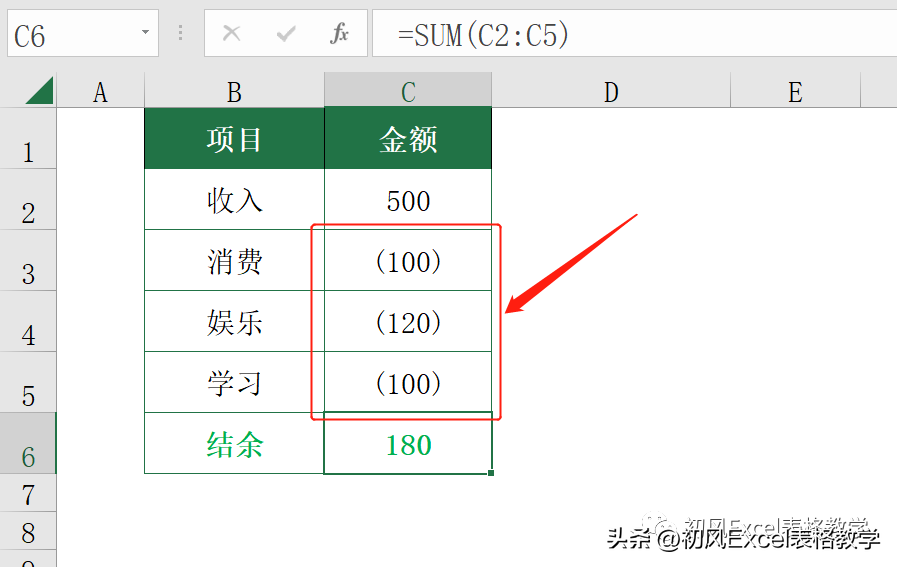在C6单元格计算结余金额,输入公式: