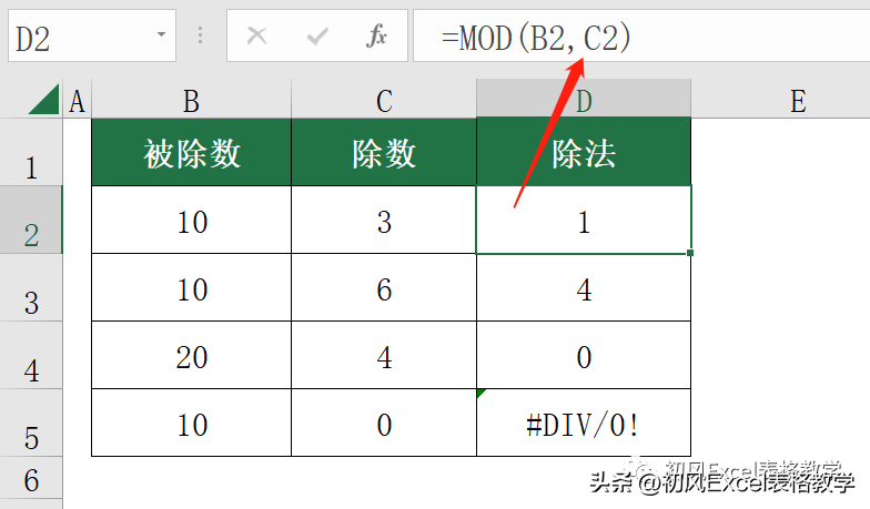 在D2单元格输入公式:=MOD(B2,C2)