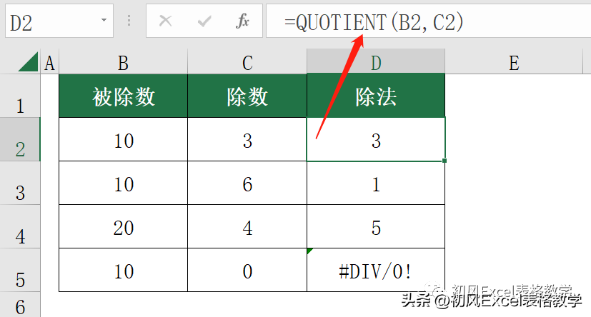 在D2单元格输入公式:=QUOTIENT(B2,C2)