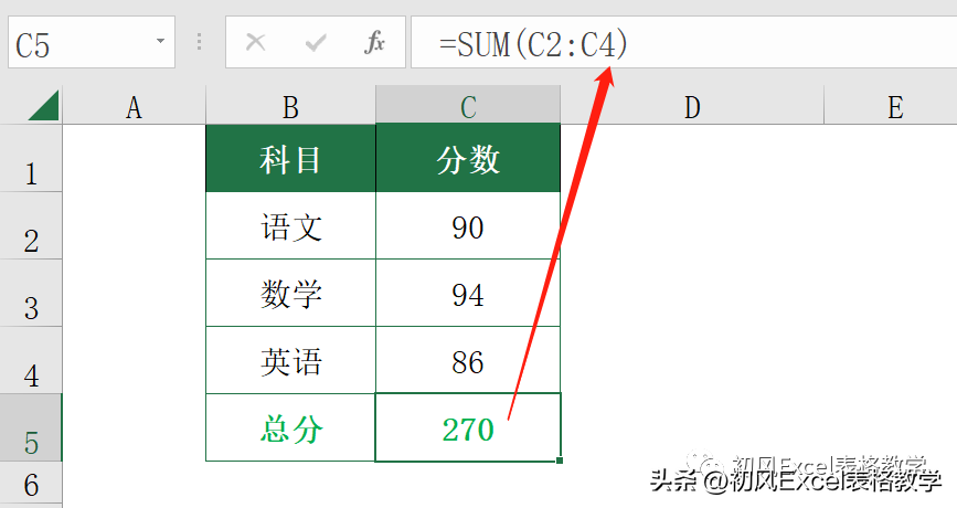 计算各科目总分,在C5单元格输入公式: