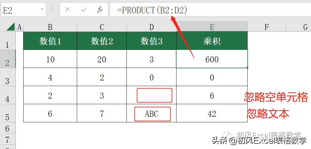product函数忽略空单元格和文本。比如D4单元格是空单元格,E4单元格的公式就只计算B4、C4单元格数值的乘积。D5单元格是文本,E5单元格就只计算B5、C5单元格的乘积。