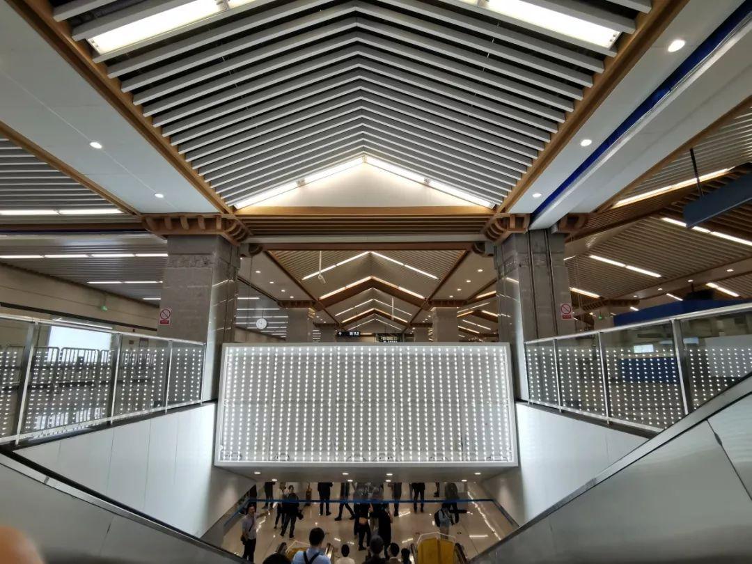 本站是多柱站,层高较高,建筑条件优越,为保证最大程度的利用空间,在延续1号线一期斗拱元素的基础上,以古建屋脊的建筑形式做顶部造型,提高站内空间,利用多柱的特点,在柱头做斗拱的造型,及西咸元素纹样雕刻,既有古典斗拱的元素在内,又有西咸造型语言,与已开通线路统一风格,完美结合。