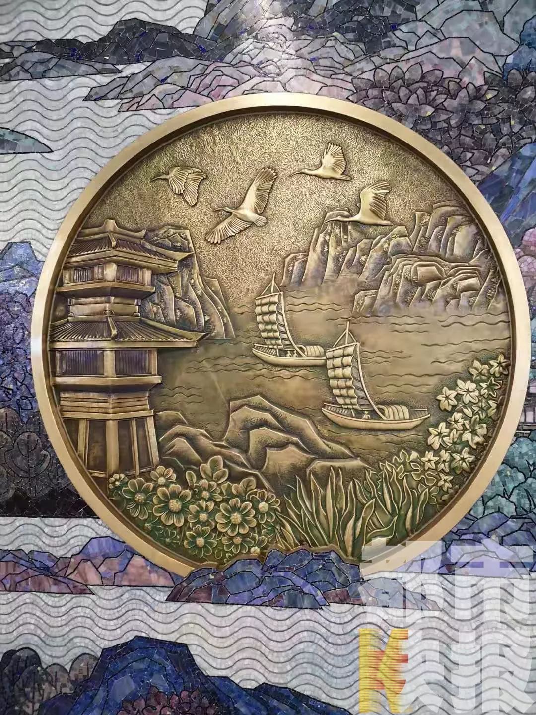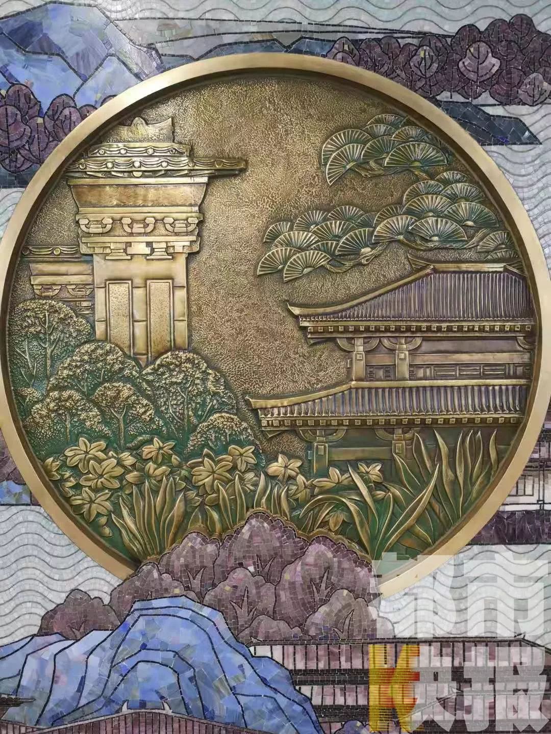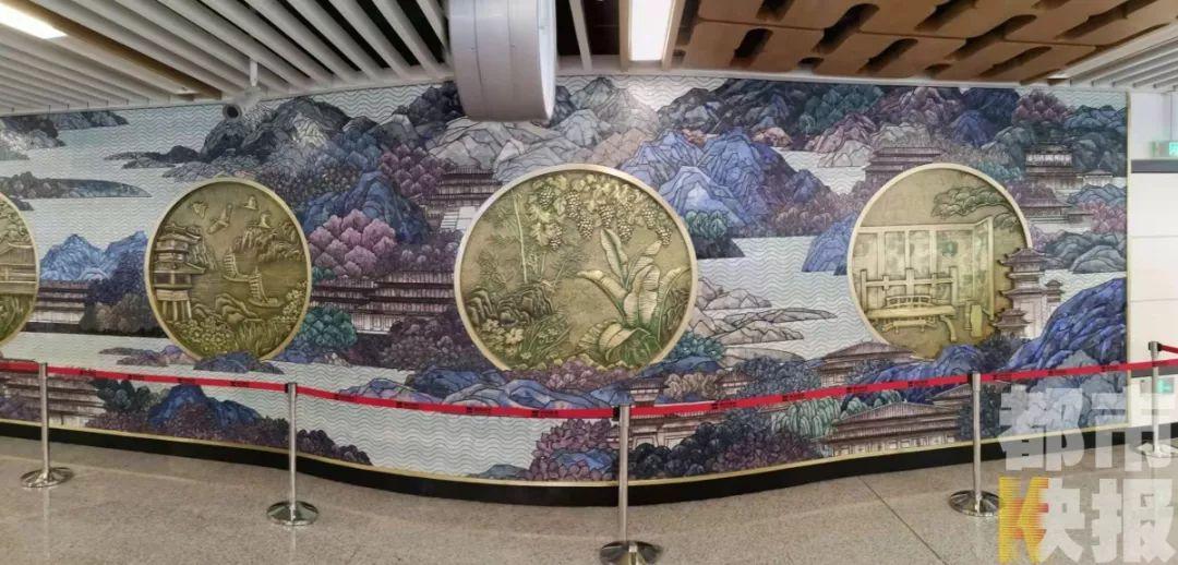 上林路这站比较特殊,该站位于历史上曾是周、秦、汉、唐的皇家园林上林苑范围,所以这一站的文化墙非常精美大气。上林路站人文景观墙设计画面以上林苑为创作背景,以“奇珍异兽、琼楼玉宇、山水池沼、奇花异草、宜居生活”五景贯穿,整体画面宫苑相连、水天缥缈。