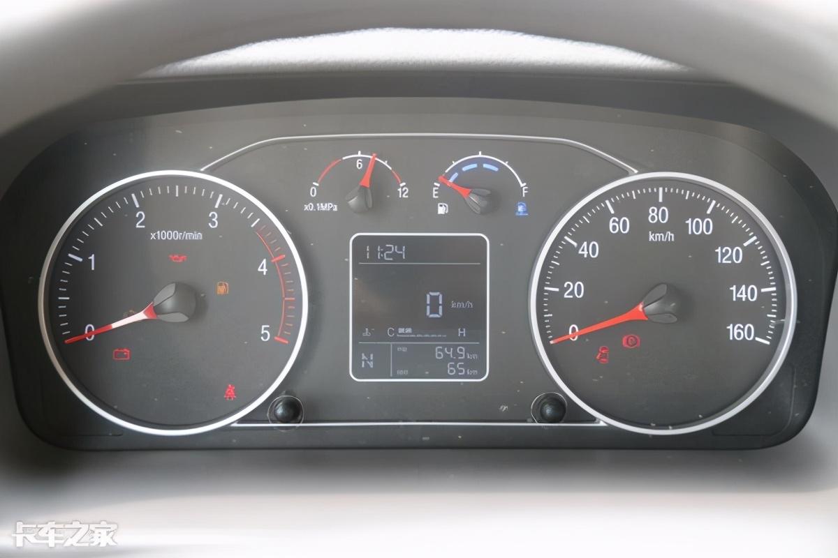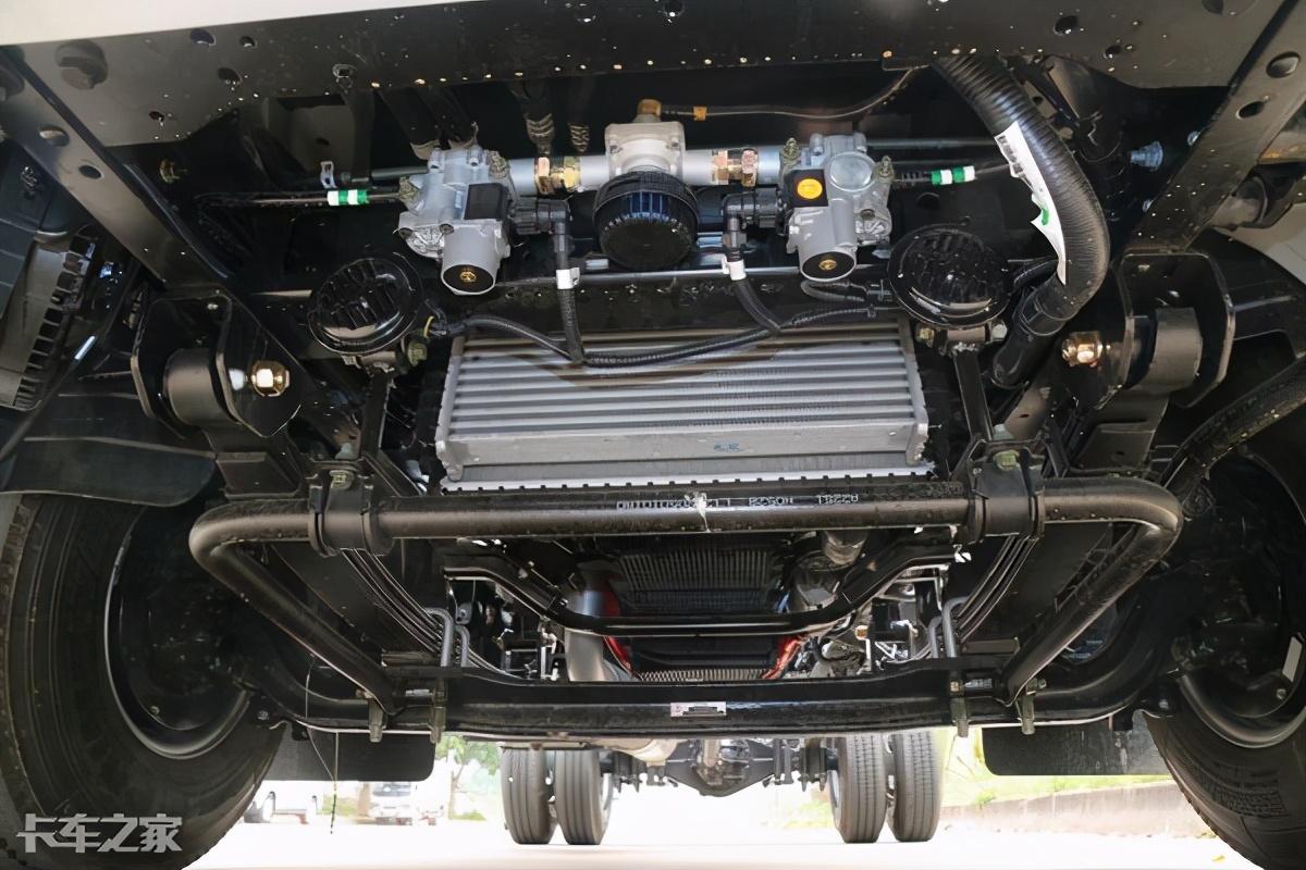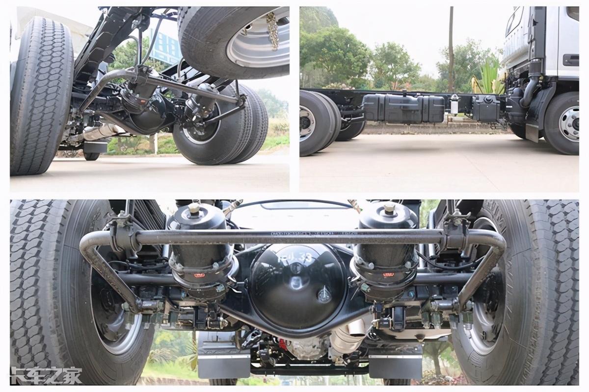 这款车采用前3后8+6的钢板弹簧悬架,后桥速比4.33。前后桥均搭配横向稳定杆,减少转弯时的侧倾,提高车辆稳定性。容量120L的油箱采用符合材料,这个容量对于轻卡来讲算是目前主流水平