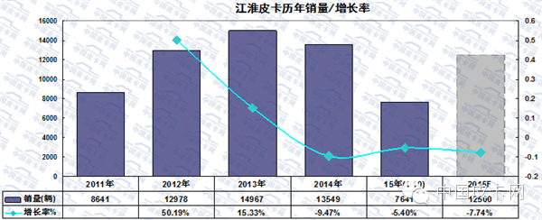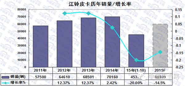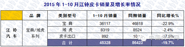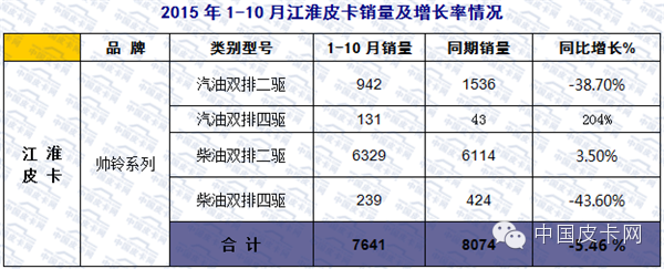 江淮皮卡 2015年1-10月,江淮皮卡车销售7641辆,累计同比-5.5%的微跌状。今年以来,江淮皮卡依旧是二升二降,汽油双排二驱大跌、柴油双排二驱小涨;汽油双排四驱大涨而柴油双排四驱大滑。江淮皮卡车自2010年下线上市后,2013年达到了近1.5万辆,2014年又下跌近10个百分点。今年预计可能能超过一万辆。不过江淮皮卡能够在短暂的几年中做大做强,已经相当难能可贵了,未来江淮会陆续推出帅铃T6汽油版、四驱、自动档及房车改装车等车型,这将会改写江淮皮卡的产品结构,大大提升其市场综合竞争力。