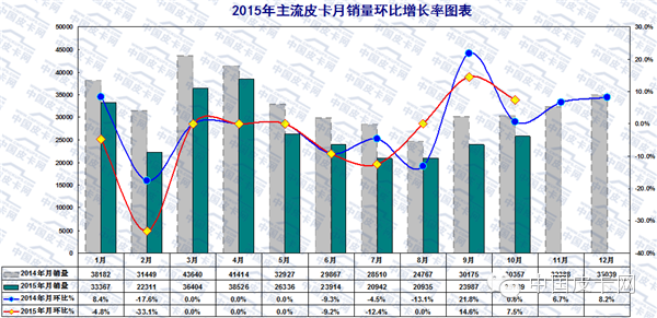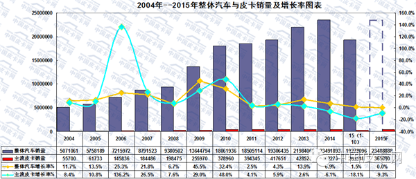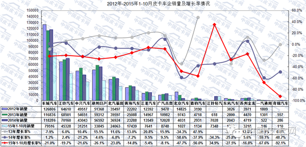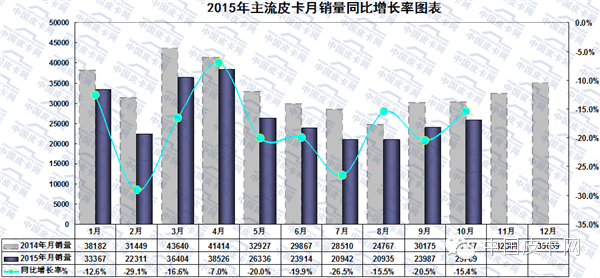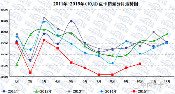 2015年1-10月,全国总体汽车共销量1927.81万辆,累计同比增长率1.51%,其中商用车销量279.34万辆,累计同比增长率-10.6%;广义载货车(含各类底盘)销量264.2万辆,累计同比增长率-11.9 %,其中广义轻型载货车(含各类底盘及皮卡)销量127. 4万辆,累计同比增长率-6.94%。十六家主流品牌皮卡整体销量26.69万辆,累计同比增长率 -18.11%。按分品牌销量增长率最小跌幅为-5.4%,最大跌幅为-92.1%,十六家主流品牌皮卡只有江铃轻汽一家皮卡销量实现了正增长(江西五十铃D-MAX今天刚上市,没有同期对比),其余十四家皮卡品牌销量全部呈下滑的态势。与此同时,各大车企的皮卡出口量也呈现出一片哀鸿的大跌之势,主要靠出口皮卡的车企,今年竟全成了瘸腿,拖累了部分销量。但值得关注的是:前十个月,十六家主流品牌皮卡销量续9月环比回升后,10月销量环比又持续抬升,预期到12月份环比可实现正增长率的态势,预计全年在国家没有再出台剌激车市政策和对皮卡车开禁的情况下,整体皮卡市场销量不会超过40万辆,增长率在负十个百分点左右,为十三年跌幅最大的一年。不过今年也是皮卡市场的优胜劣汰之年,一些产品技术含量低且生产规模与销量小的皮卡车企,将会在未来的三年之内被淘汰出局,皮卡市场格局将会重新洗牌。