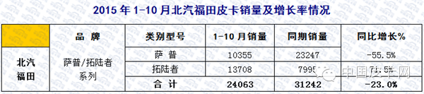 北汽福田皮卡 2015年1-10月,北汽福田皮卡车销售 24063辆,累计同比-23.0%。老款萨普的销量下降与新款拓陆者市场的扩大,形成强烈的对比。不过老款萨普与江铃宝典皮卡一样,依然是主打主销产品的“长青树”,市场上还是需要这样价廉物美和皮实耐用的皮卡车。与此同时,拓陆者由于不断对其年型车进行升功级和部分换代,在今年的销售中成为为数不多的增量车型品系,实现了七十个百分点以上超强增长而可圈可点。