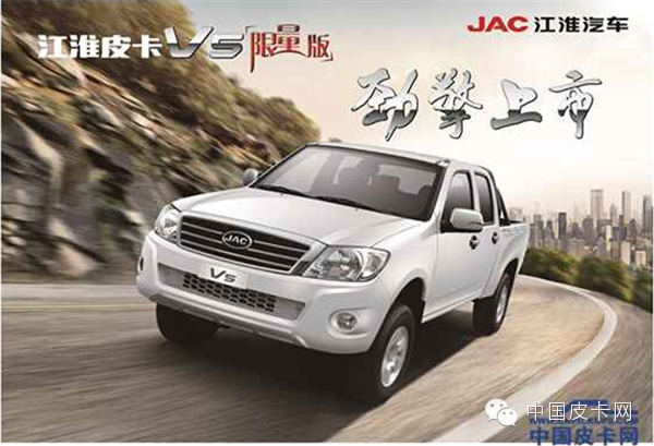 3、江淮皮卡再推V5限量版 今年江淮推出了其战略级皮卡产品——帅铃T6,全面布局中国高端皮卡市场。10月份,江淮皮卡于近日又推出V5限量版皮卡,主打中端市场。至此,江淮皮卡已初步形成T6布局高端,V5主打中端,V1面向经济型皮卡市场的产品格局。V5限量版共搭载3款动力,其中两款柴油、一款汽油,价格区间涵盖6-8万元,覆盖国内皮卡主销价格区间。新车增加了用户关注的货箱宝(货箱耐磨涂层)、双侧登车踏板等,同时,还提供1735mm长货箱品种。