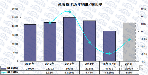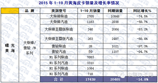 丹东黄海皮卡 2015年1-10月,黄海皮卡车销售17439 辆,累计同比-14.8%。老款大柴神汽/柴油版、大柴神至尊版汽/柴油和傲骏汽/柴油版的销量全处于大跌大滑之中,唯有新锐车型N系列(原R系列已更改为N系列)以12795辆的较好成绩单项支撑了其继续下滑的势头。这些年来,黄海皮卡的新品不断涌现,无论是传统燃油皮卡还是新能源皮卡车都不断下线上市,在业界起到了领头羊的作用。