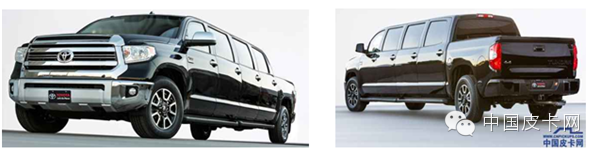 5、丰田Tundrasine8门皮卡亮相 2015年的SEMA国际改装车展上,这辆名为 Tundrasine的丰田皮卡是基于坦途1794 Edition CrewMax打造而来,最大的变化就是它被改成一辆加长版的豪华轿车,轮距达到了2286mm。该车搭载一台5.7升V8发动机,最大功率381马力,峰值扭矩543牛米,匹配一台6速自动变速箱。经过特殊改装后,这辆车的自重达到了3618公斤,比标准版坦途皮卡重了1037公斤。内饰部分则打破固有设计,仿照私人飞机的理念,将高档与奢靡融合在了一起,并采用多功能棕色真皮座椅,以及大量的木材装饰条和白色的车顶配色形成对比。Tundrasine概念车还设计了独立的后排座椅,金属装饰和强大信息娱乐系统。