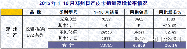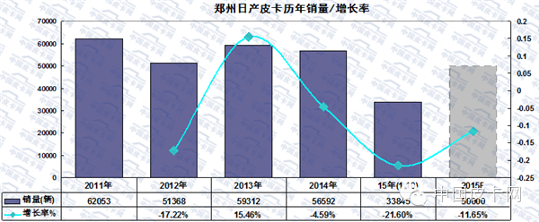 郑州日产皮卡 2015年1-10月,郑州日产皮卡车销售33845 辆,累计同比-26.1%,其中出口量大跌七成。预期随着郑州日产今年又一新款皮卡产品的下线上市,全年实现超5万辆的市场目标值还是有可能实现的。2011年,在国家的汽车“上山下乡”中以及当年普遍皮卡出口市场看好的情况下,郑州日产皮卡的国内国际销量突破了6.2万辆以上大关,以后这三年的市场容量一直徘徊于5.5万辆上下,今年若在新品给力和年底的惯例冲量努力下,可达到市场预期目标值。郑州日产旗下产品包括日产、东风、东风风度三大品牌,此前发布了到2016年的中期发展规划,明年郑州日产三大品牌将投放一系列产品形成“3+2+E”的矩阵,“3”是指形成3个年产量过10万辆的明星车型,包括SUV、皮卡和CDV三大品类。