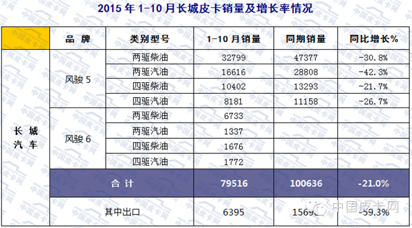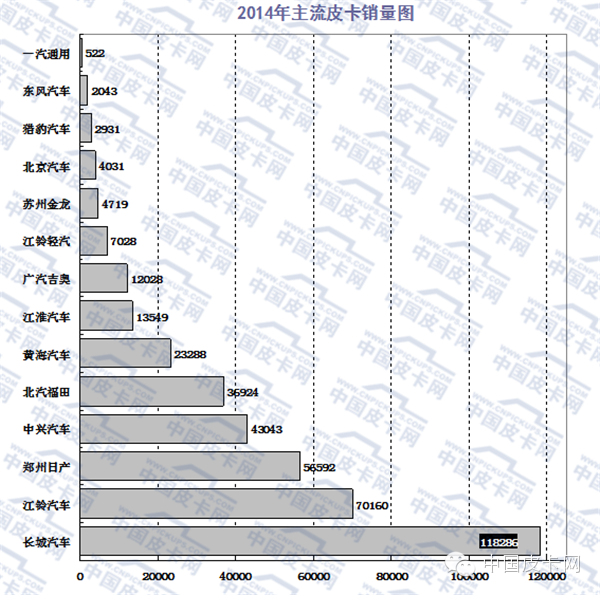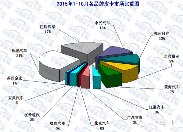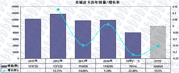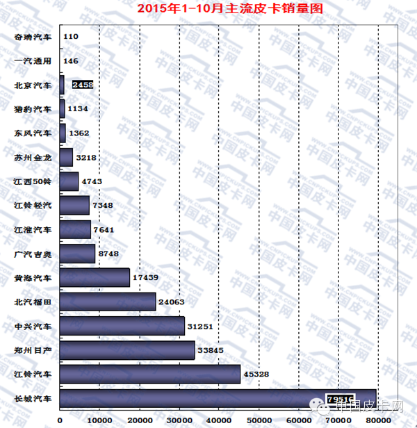 长城皮卡 2015年1-10月,长城皮卡销售79516 辆,累计同比-21.0%。今年能否再次突破10万辆大关,对长城皮卡是个严峻考验。此外,面对今年和明年,一些中、高端新锐品牌皮卡的威胁挑战,长城皮卡又将如何应对?又有何新产品下线上市?这都是关切皮卡老大地位必须要思考与应对的挑战,尤其是近年来江铃皮卡与长城皮卡的销量和市场份额的不断拉近。