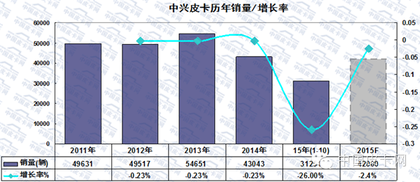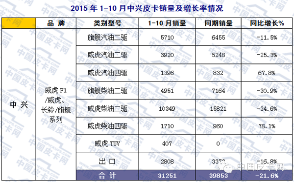 中兴皮卡 2015年1-10月,中兴皮卡车销售 31251辆,累计同比-21.6%。除威虎汽油四驱、威虎柴油四驱与威虎TUV正增长外,其他汽、柴油机型皮卡全部呈二位数的下降趋势。出口也下滑16个百分点。不过在十月份的 “中国政府援缅甸警用设备项目”招标中,中兴汽车成功中标245台中兴威虎TUV-DK4四驱柴油版皮卡,并于10月底从天津港出发,11月上旬到达邻国缅甸。