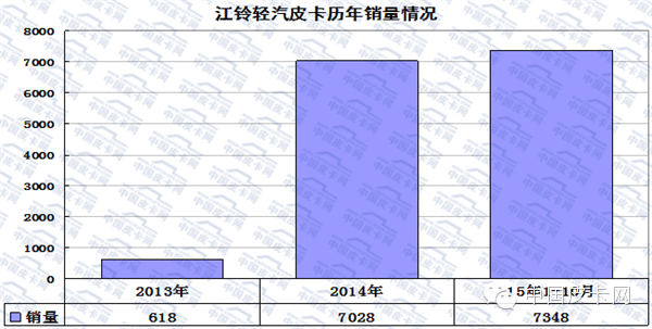 江铃轻汽皮卡 2015年1-10月,江铃轻汽骐铃皮卡车销售7348辆,累计同比35%。今年1-10月份,江铃轻汽骐铃皮卡又是一个超高速增长的发展态势,预计全年江铃轻汽骐铃皮卡的销量能达到一万辆左右。江铃轻汽骐铃皮卡这近三年的销售创造了中国汽车历史上的奇迹,分析如下:一是产品的市场定位精准、二是适销对路、三是性价比较高、四是皮实耐用、五是价廉物美、六是商务政策定的灵活而实用性强、七是售后服务做得到位、八是充分利用了中国汽车报的“皮卡中国行”这个非常给力又接地气的平台,来大力产品促销和推广自己的品牌,取到了事半功倍的成效。笔者认为这八点就是江铃轻汽骐铃皮卡制胜的关键所在,也是不二法宝。