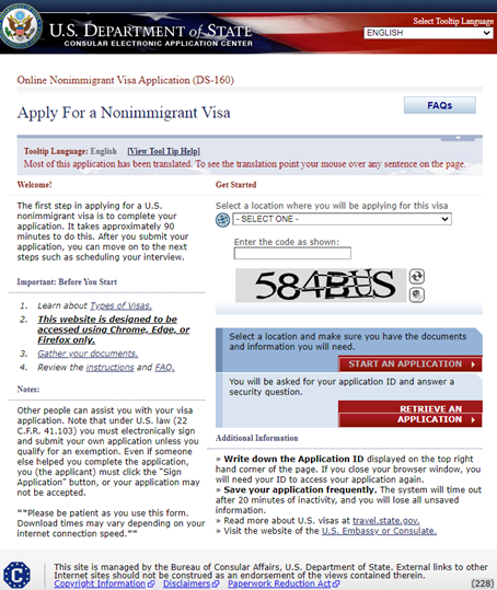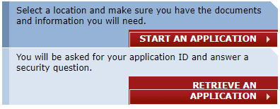 4. 测试完成后点击“START AN APPLICATION”进行申请。“RETRIEVE AN APPLICATION”可以找回已经填写申请,包括已经生成表格的。不要忘记输入验证码。
