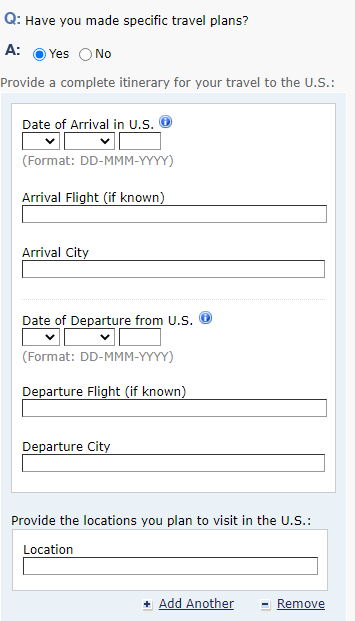 是否有具体行程,一般选是的话会有许多特定要填写内容,如航班号,访问城市之类,见下图: