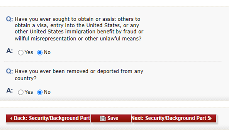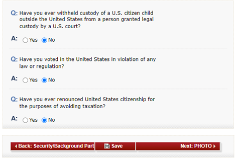 这里注意,如果被美国撤销签证或遣返过,请如实填写。