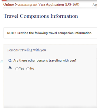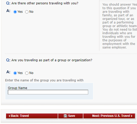 随行人信息。一般单人成团,这里填NO,没有随行人;和其它人一起成团,这里选YES,下一个问题也选YES,并在“GROUP NAME”这栏填写团长的单位名称。如下图: