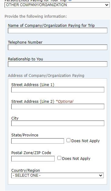 最后费用支付如果出访单位承担选“PRESENT EMPLOYER”,其它单位承担选“OTHER COMPANY/ORGANIZATION”填写具体信息,如下图: