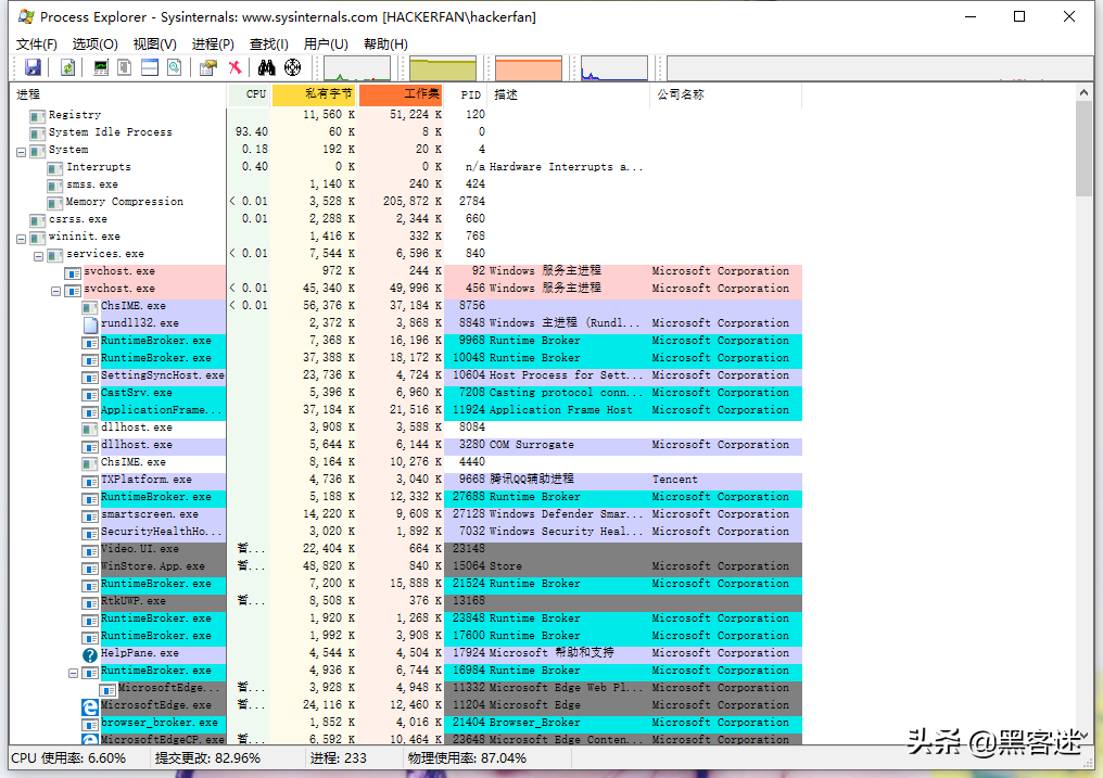 Process Explorer 是一款由 Sysinternals 公司开发的一款系统软件 , 可以列出了PC上每个正在运行的应用程序,以及有关正在运行的进程和打开的文件的信息。在Process Explorer中,列表以树形结构显示,所有内容均显示在两个面板的窗口中。上面的面板列出了当前的应用程序,而下面的面板使您可以访问有关所选过程的详细信息。您可以选择停止单个应用程序,更改当前正在运行的进程的优先级以及查看每个进程的属性。这些属性显示每个进程占用了多少内存和空间。您还可以使用Process Explorer查找有关系统的特定信息。其中包括系统当前运行状况的摘要,以及CPU,内存,输入和输出的统计信息和图表。