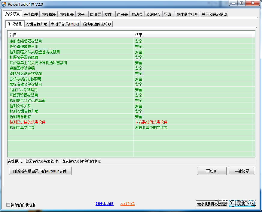 PowerTool 一款免费强大的进程管理器,支持进程强制结束,可以解锁占用文件的进程,查看文件/文件夹被占用的情况,内核模块和驱动的查看和管理,进程模块的内存的dump等功能。最新版还支持上传文件在线扫描病毒。支持离线的启动项和服务的检测和删除,新增注册表和服务的强删功能,可在PE系统下清除感染MBR的病毒(如鬼影等)。