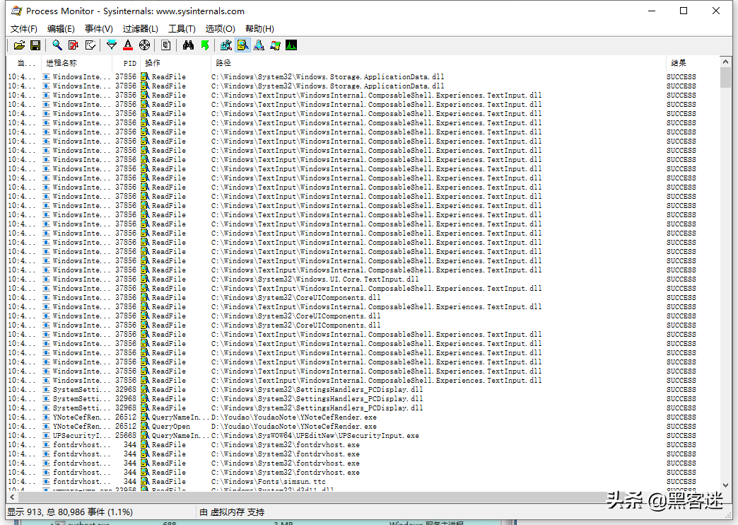 Process Monitor 也是一款由 Sysinternals 公司开发的包含强大的监视和过滤功能的高级 Windows 监视工具,可实时显示文件系统、注册表、进程/线程的活动。可以捕获进程的详细信息,包括映像路径、命令行、用户和会话 ID等功能非常强大。它结合了两个 Sysinternals 的旧版工具 Filemon 和 Regmon 的功能,并添加了一个包含丰富的和非破坏性的广泛增强过滤功能列表,全面的事件属性(例如会话 ID 和用户名称),可靠的进程信息,每个操作的完整线程、堆栈与集成符号支持,同时记录到一个文件中,以及更多。其独一无二的强大功能将使 Process Monitor 在您的系统故障排除和恶意软件检测中发挥重要的作用。Process Monitor 可以说是安全人员必备工具之一,在对恶意软件分析中担任着很重要的角色。