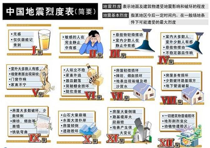 地震烈度是指地震时某一地区的地面和各类建筑物遭受到一次地震影响的强弱程度。我国采用12度的地震烈度表,各个烈度等级由人的感觉以及建筑物震害程度等进行表述,可参见作为国家标准颁布的《中国地震烈度表》。