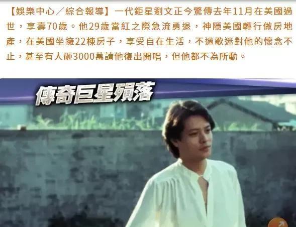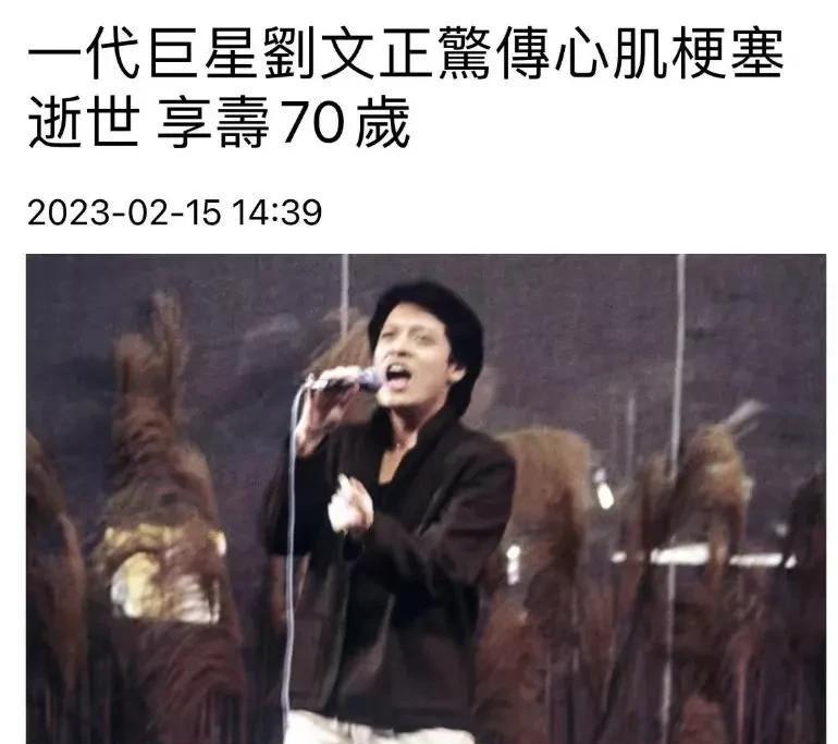 2月16日,知名巨星刘文正被经纪人确实死亡。