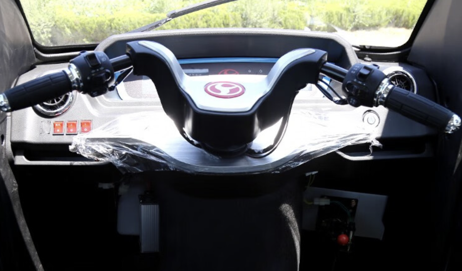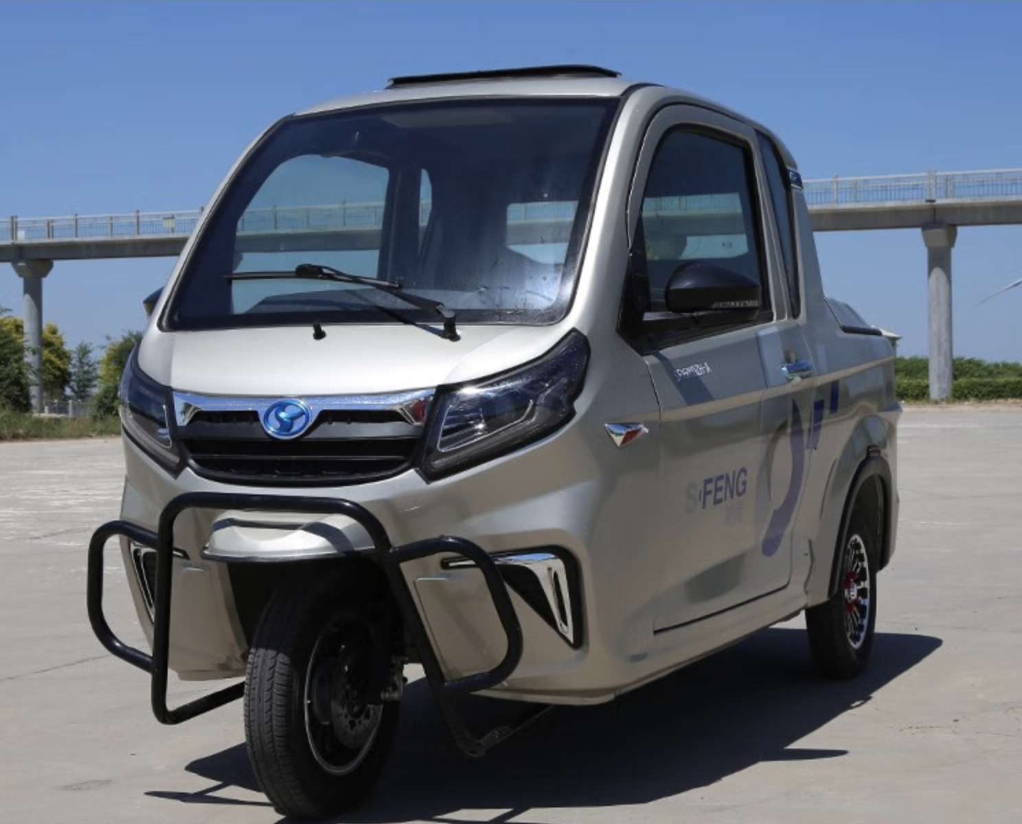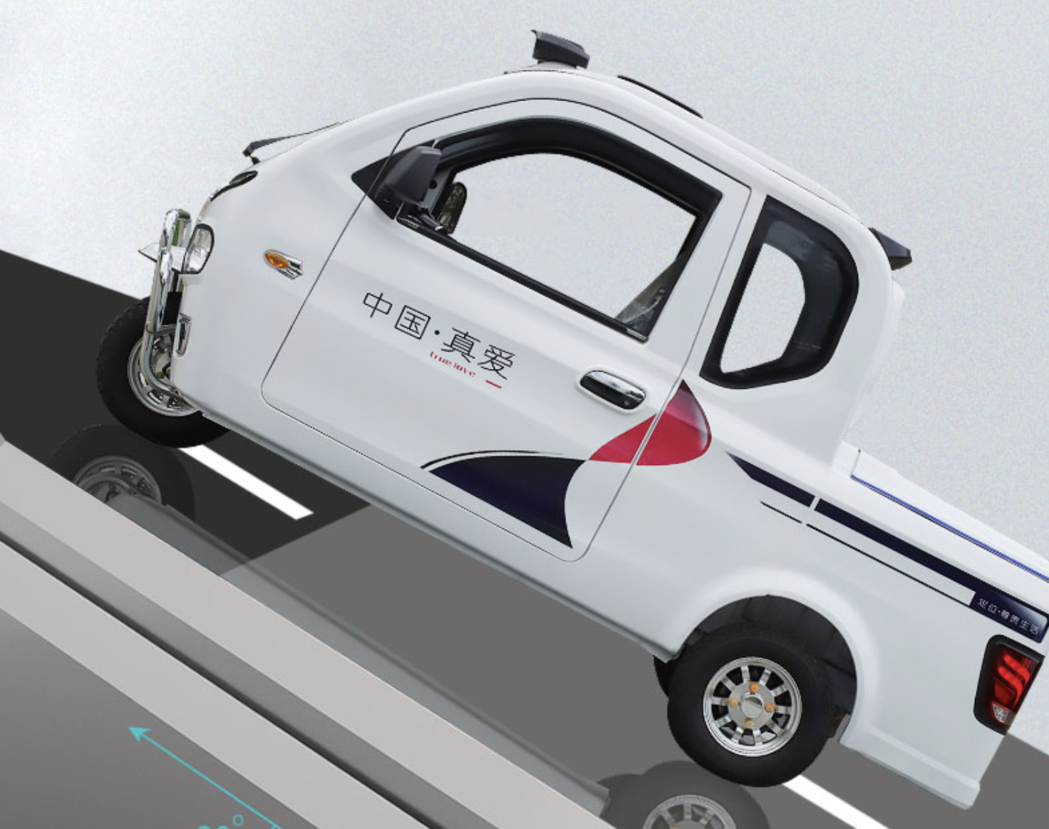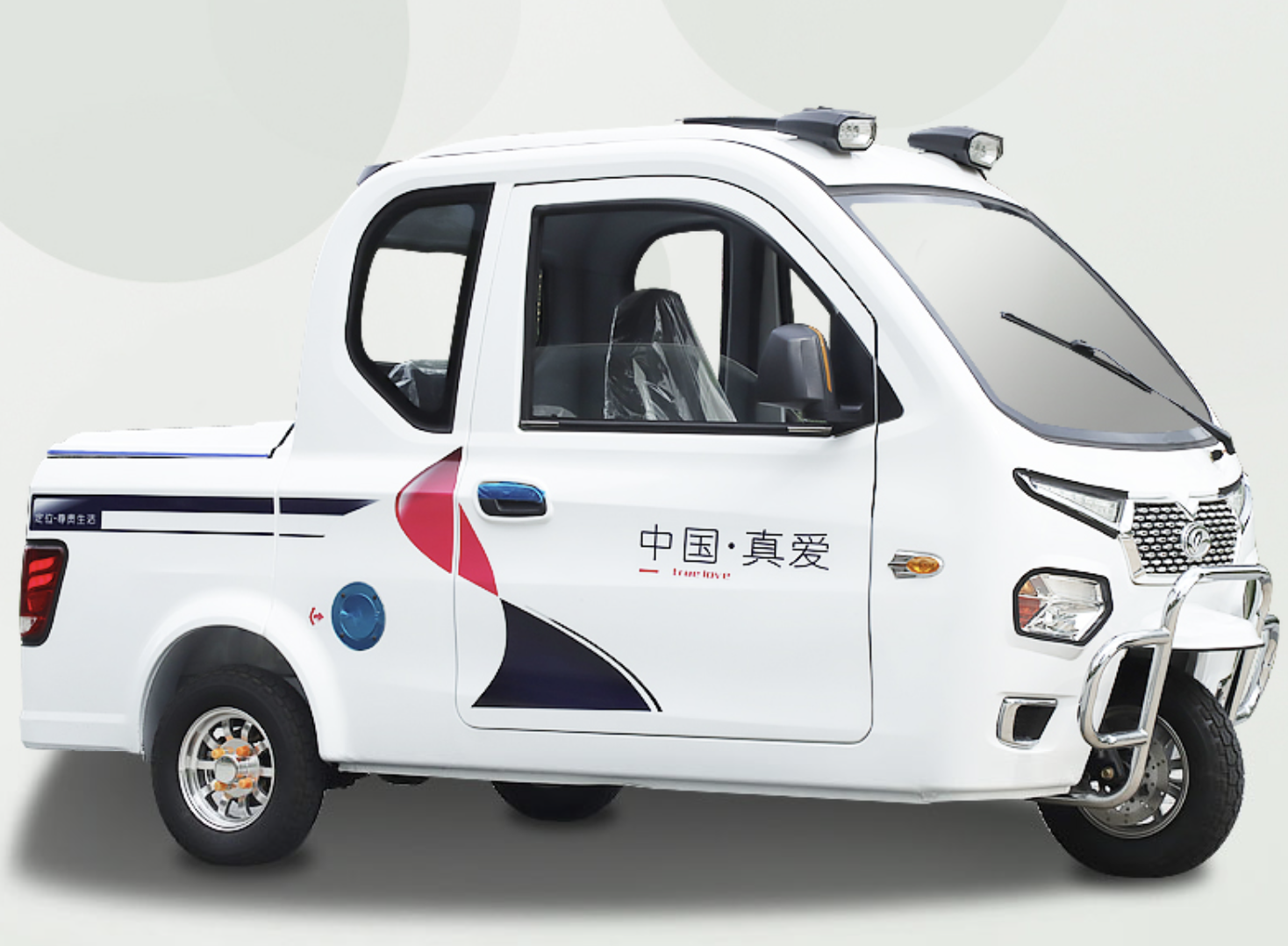 该车采用了模压铁壳,汽车的金属喷漆,质感细腻。整车尺寸为3045/1320/1600mm,空间非常宽大,该车分为驾驶舱和货运舱两部分,驾驶舱采用了双排三座的布局,货运舱尺寸为1100/1320/500mm,并且采用了加盖设计,容量大概300L左右,可载重300公斤。整车采用了三轮液压减震和4.0-10真空胎,舒适性非常好。