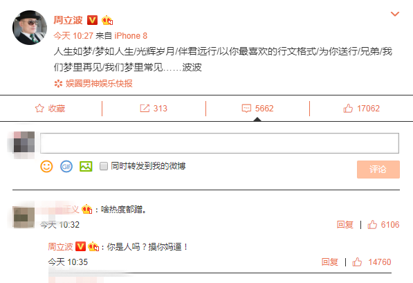 网易娱乐10月29日报道 10月29日上午,著名导演哈文发文透露了她的先生李咏在美国病世的消息,许多观众深感震惊和哀痛,网友纷纷悼念:“咏哥,你一路走好!”随后,周立波在网上发文缅怀李咏:人生如梦/梦如人生/光辉岁月/伴君远行/以你最喜欢的行文格式/为你送行/兄弟/我们梦里再见/我们梦里常见……波波。不料遭到网友嘲讽:啥热度都蹭,周立波看到后十分愤怒,直接爆粗口回怼:你是人吗?