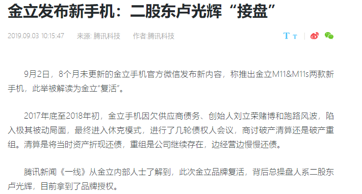 问题来了,既然金立已经破产,那么今天我们看到的金立手机又是从何而来?根据相关资料,2019年9月2日,金立二股东卢光辉成功拿下金立品牌授权。自此,所有市面上贴牌金立的产品均由代工厂商负责生产。新产品每卖出一台,就需要付10元授权费给金立,通过细水长流的盈利替金立还债。