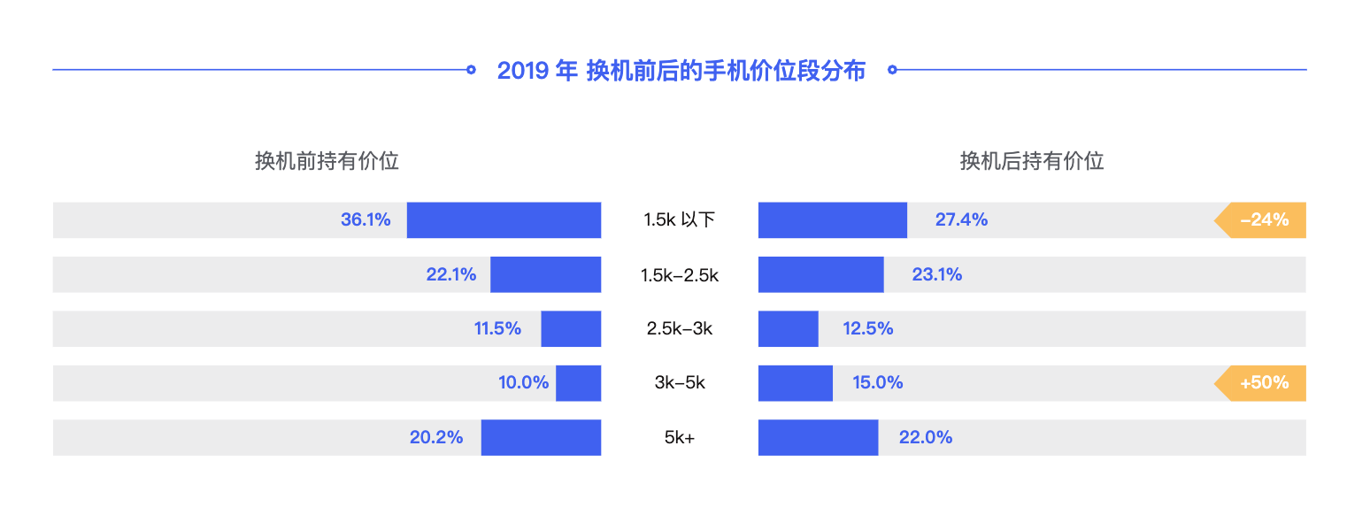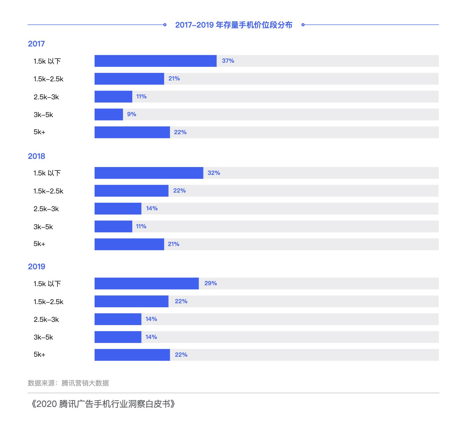 这些厂商选择这条生存之路,自然也是有原因的。根据《2020腾讯手机行业洞察白皮书》,直到前年,低端手机依然占据29%的存量市场,并且持续保持第一大细分价位档的地位。甚至在换机这方面,2019年依然有27.4%的用户选择购买低端手机,这部分人群在所有新换机用户群体中的占比依然最高。由此看来,国内低端手机市场依然存在着不错的空间。