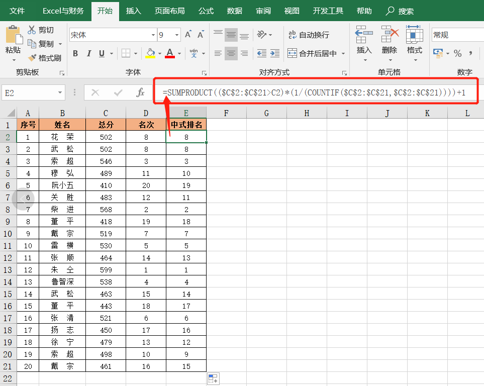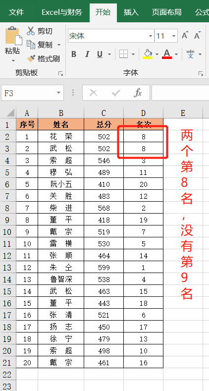 如上图,如果出现两个分数相同时,用RANK函数排名就出现两个并列名次,而下一名次就没有了,中式排名是顺序的,不存在空一名次,如下公式即可解决: