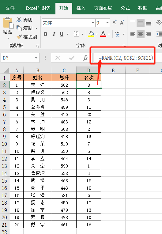 然后再选中D2单元格,双击填充公式即可完成排名次。