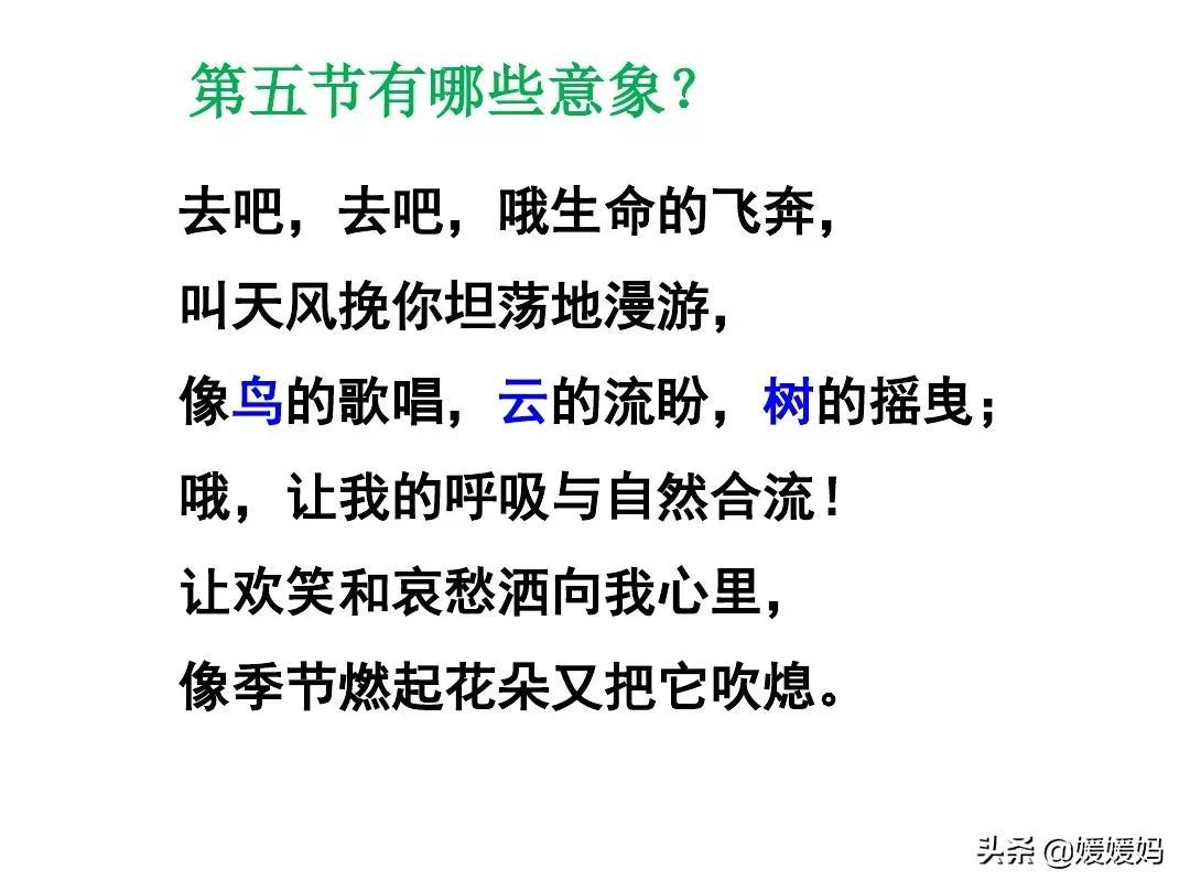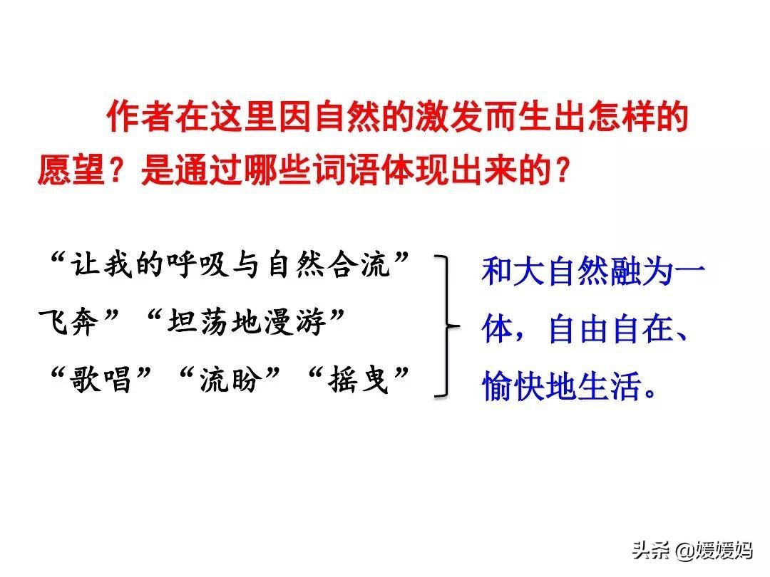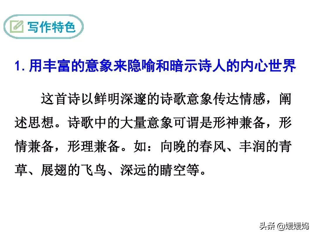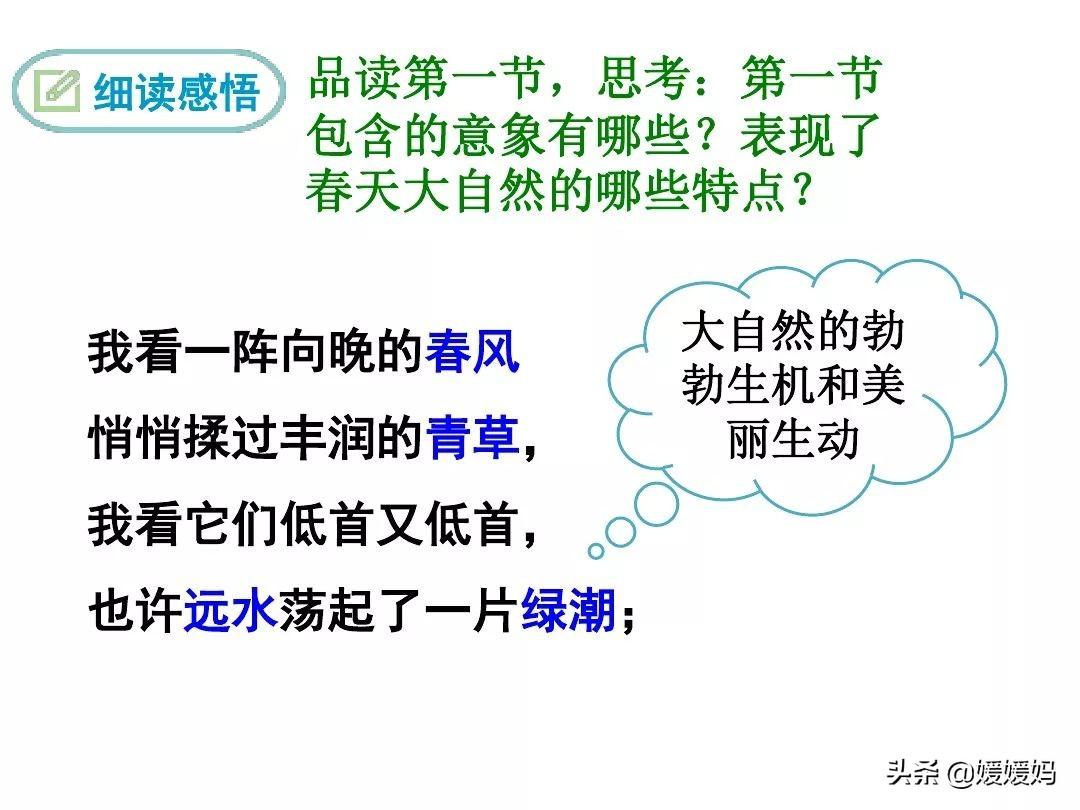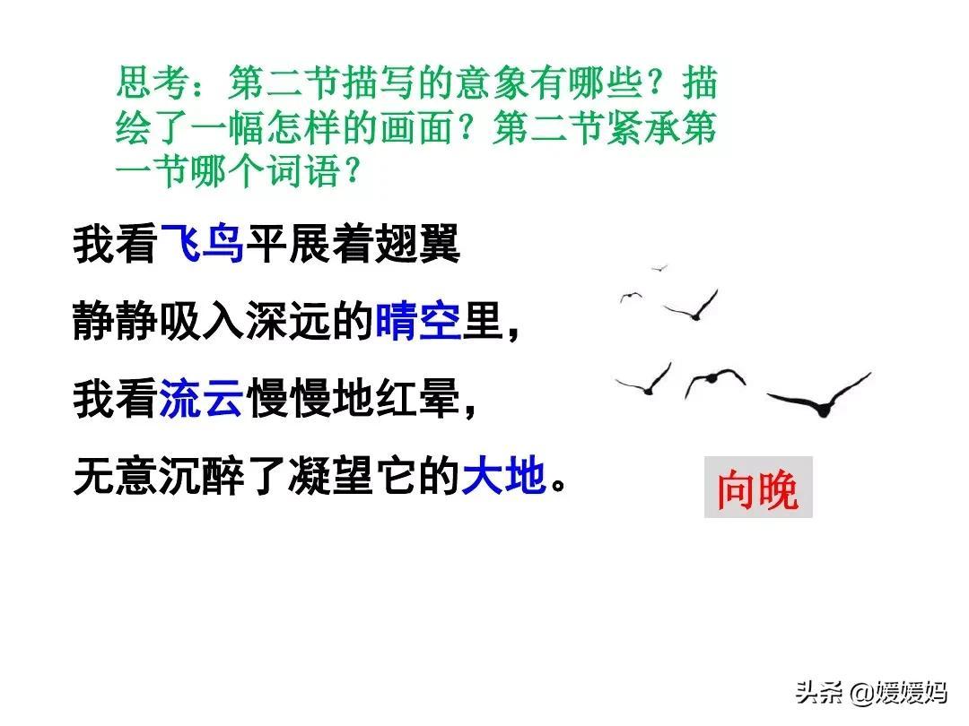 诗人看到“春风”联想到“青草绿潮”, 看到“飞鸟”联想到“静静吸入深远的晴空”, 看到“流云” “红晕”联想到“沉醉了凝望 它的大地”,作者联想自然丰富,字里行间 流露出对大自然的喜爱之情,情景交融,为 后文抒情做铺垫。
