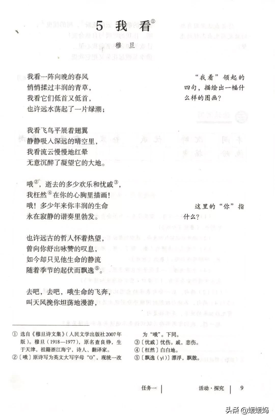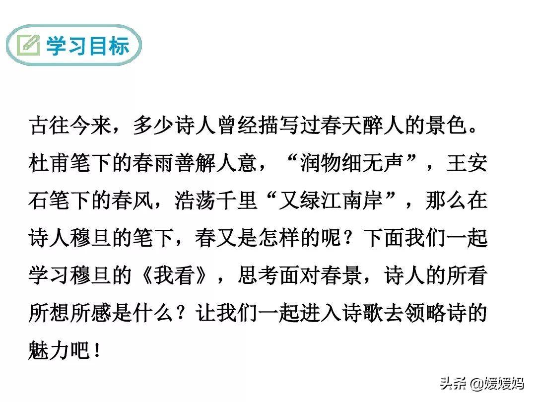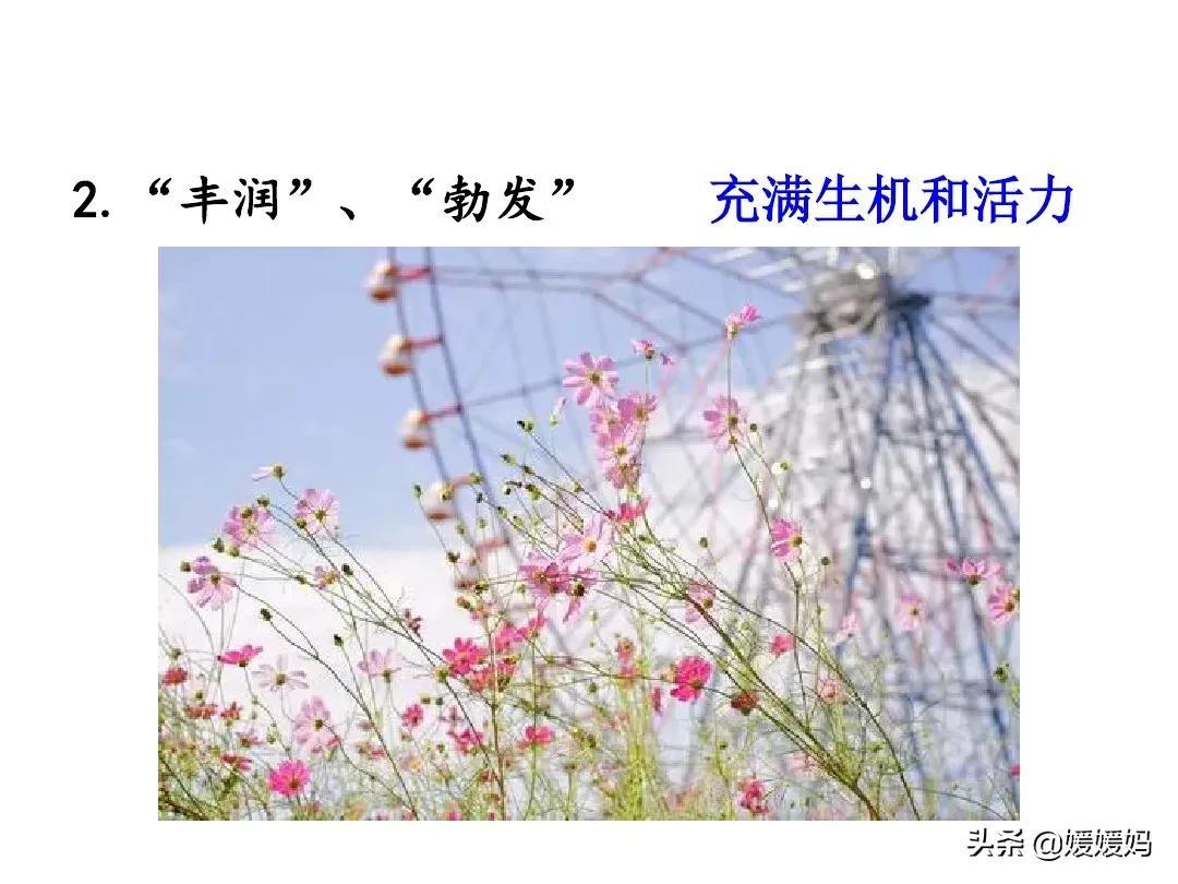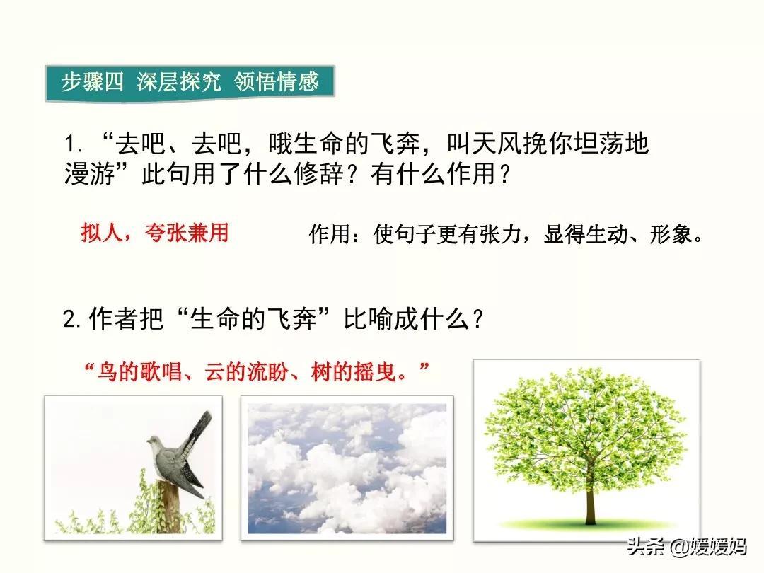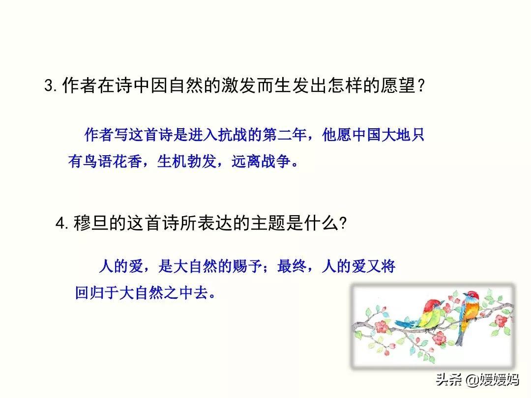诗人看到“春风”联想到“青草绿潮”, 看到“飞鸟”联想到“静静吸入深远的晴空”, 看到“流云” “红晕”联想到“沉醉了凝望 它的大地”,作者联想自然丰富,字里行间 流露出对大自然的喜爱之情,情景交融,为 后文抒情做铺垫。