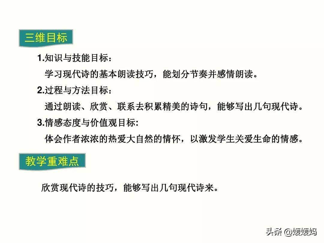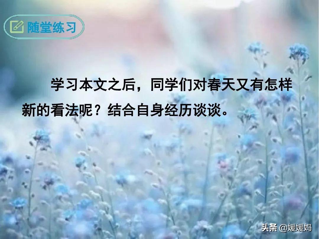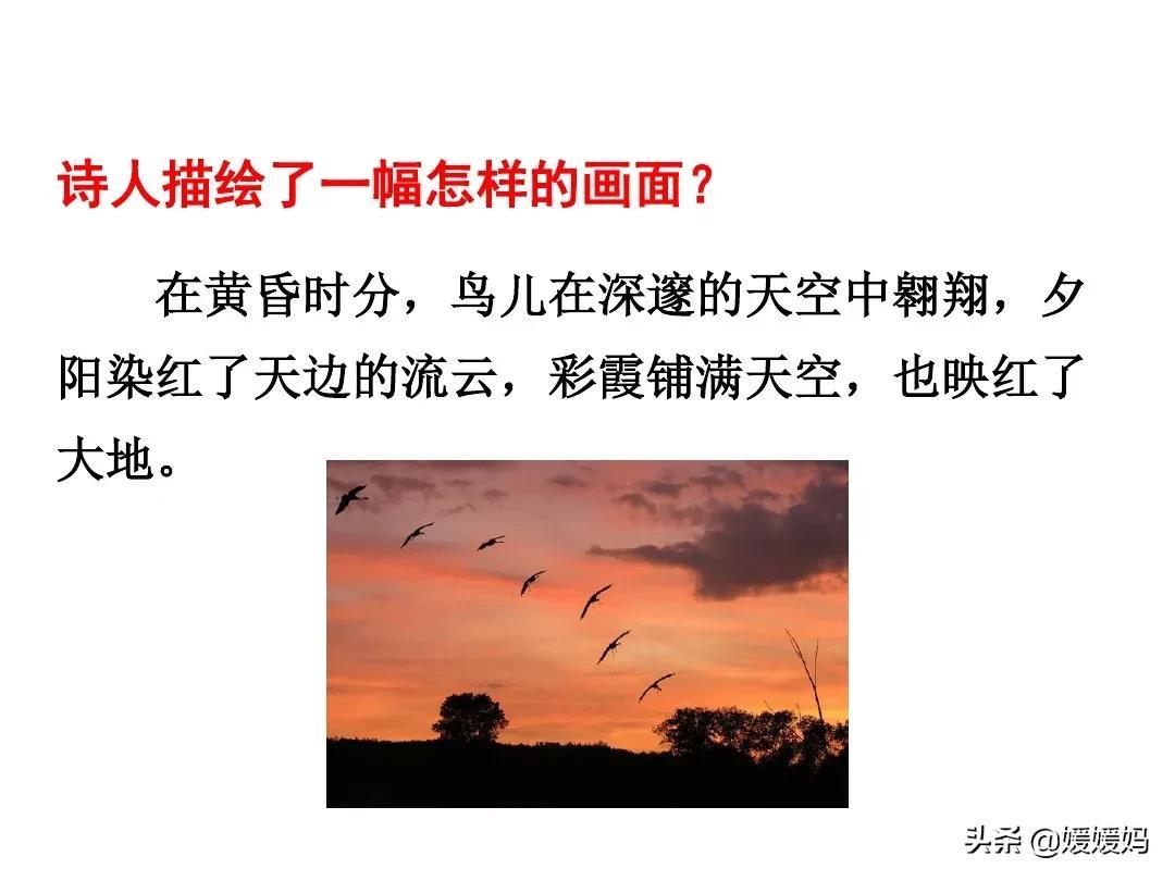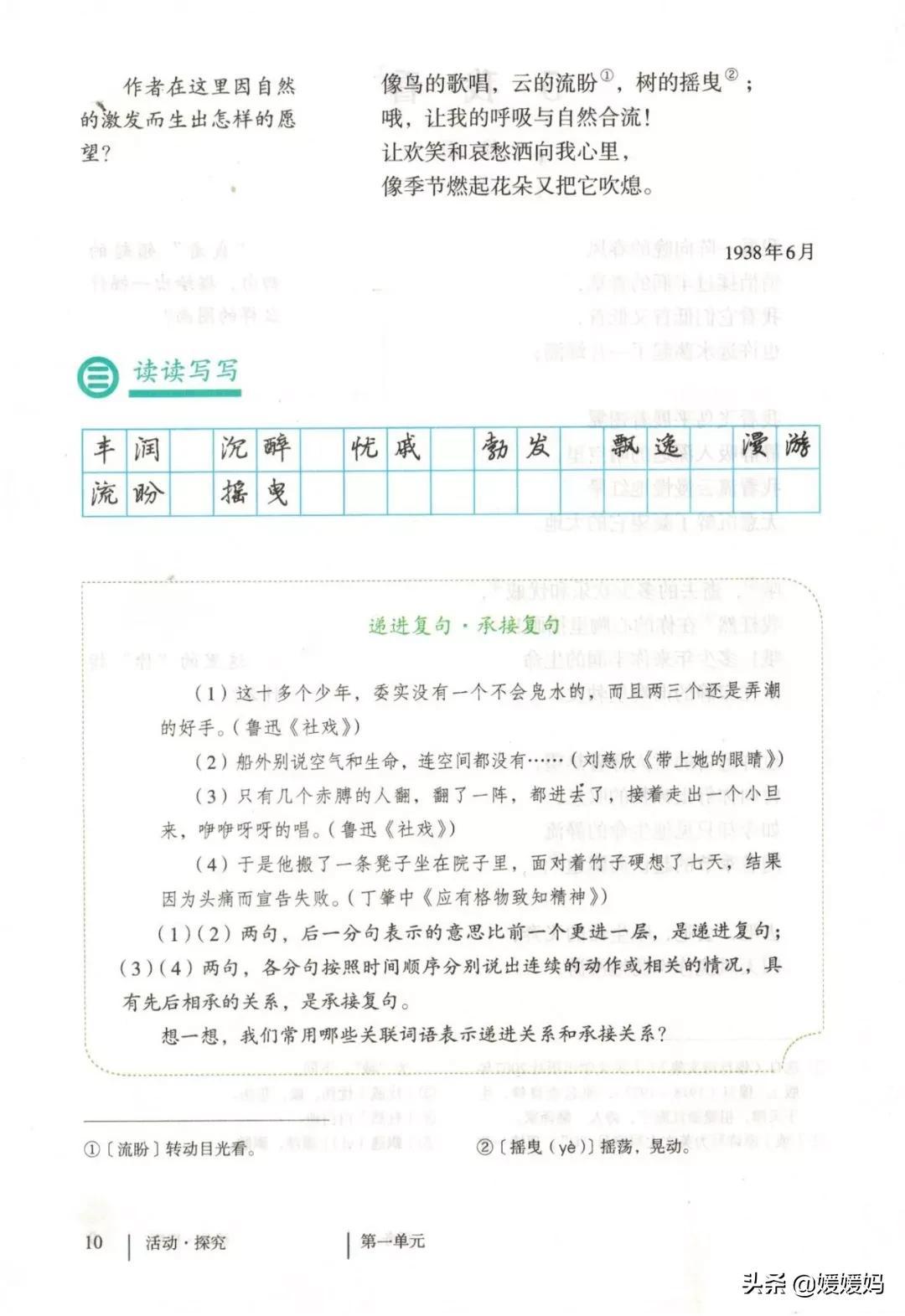 诗人看到“春风”联想到“青草绿潮”, 看到“飞鸟”联想到“静静吸入深远的晴空”, 看到“流云” “红晕”联想到“沉醉了凝望 它的大地”,作者联想自然丰富,字里行间 流露出对大自然的喜爱之情,情景交融,为 后文抒情做铺垫。