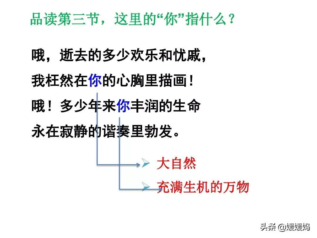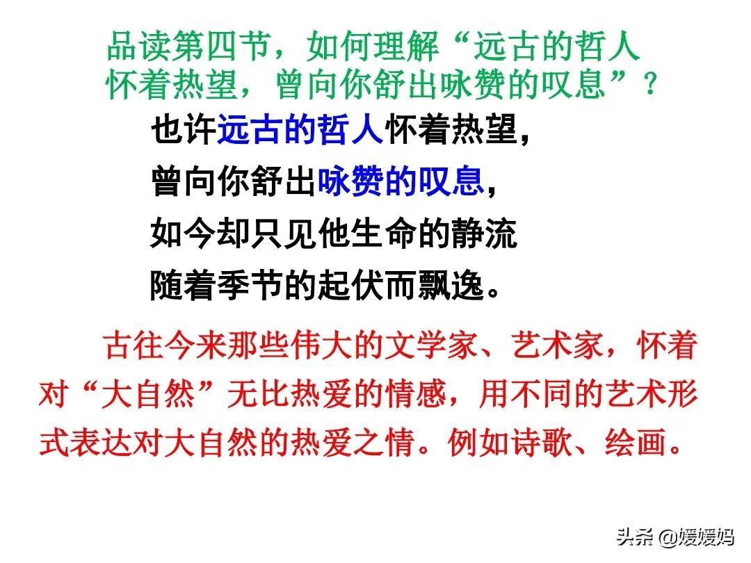 第③节主要写在孕育了万物、充满生机的大自然面前,“我”的“欢乐和忧戚”是微之甚微, 以此突出大自然的博大。第④节主要写远古的哲人的生命早已逝去, 但他们留下的对大自然的吟咏赞美一直在时间的 长河里飘逸。第⑤节在前两节的基础上,很自然地抒写出 希望将生命融人自然,让“我”的爱回归大自然 之中去,真正获得生命“巨树永青”的人生之爱 的归宿。最后一节,点明主旨,升华主题。