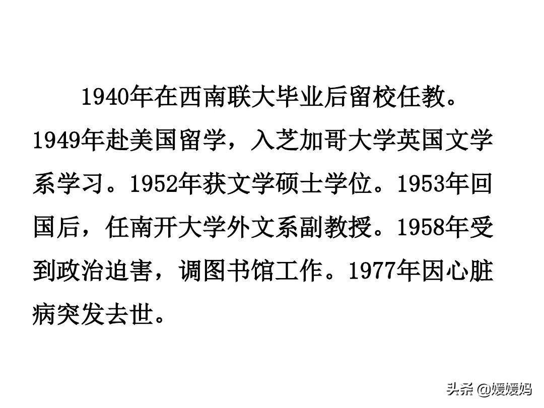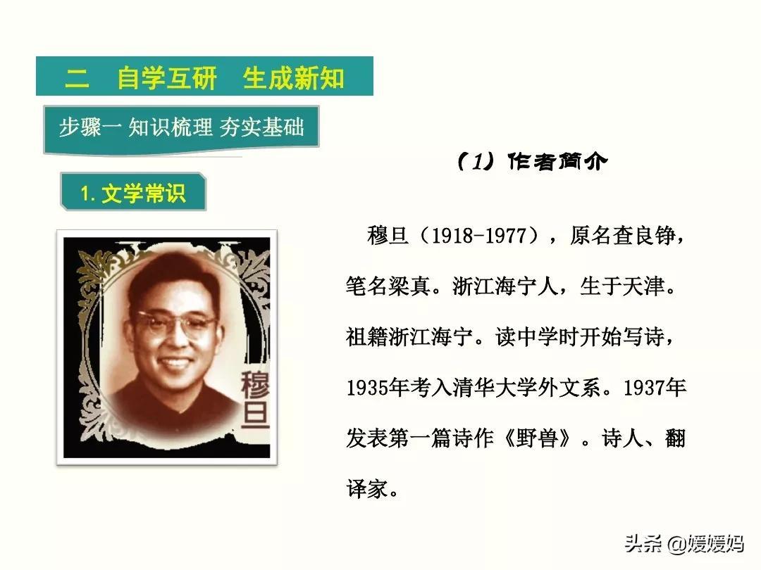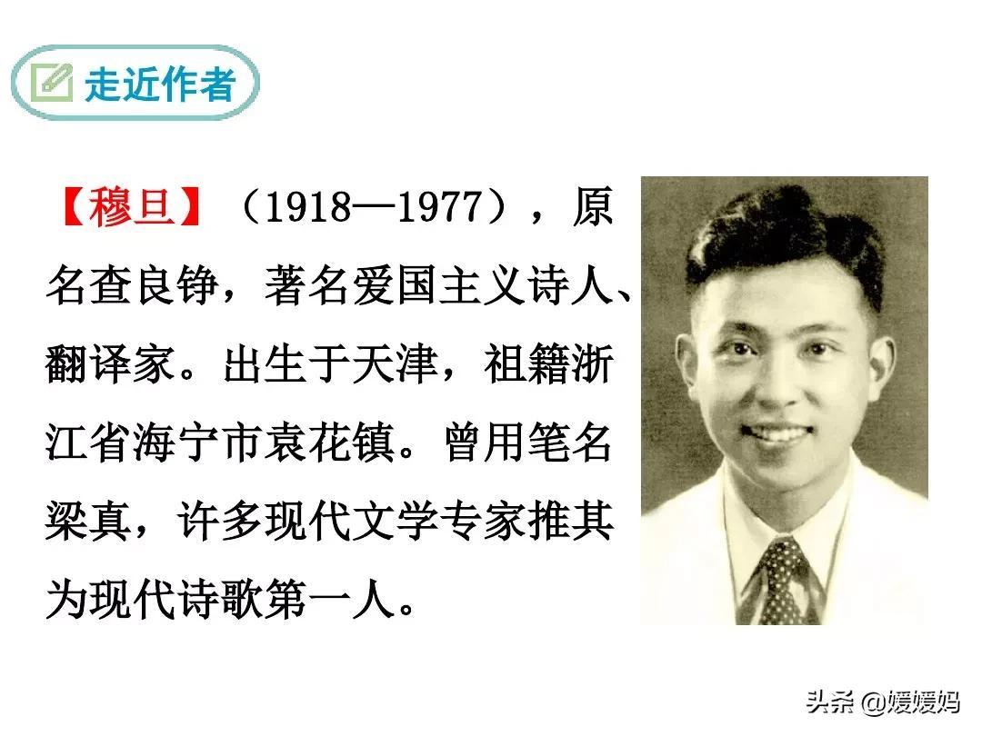 穆旦(1918—1977),原名查良铮,祖籍浙江海宁,早年留学美国,“九叶诗派”诗人。主要作品有《赞美》《诗八首》。