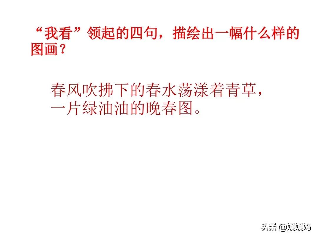 1.“我看”领起的四句,描绘出一幅什 么样的图画?