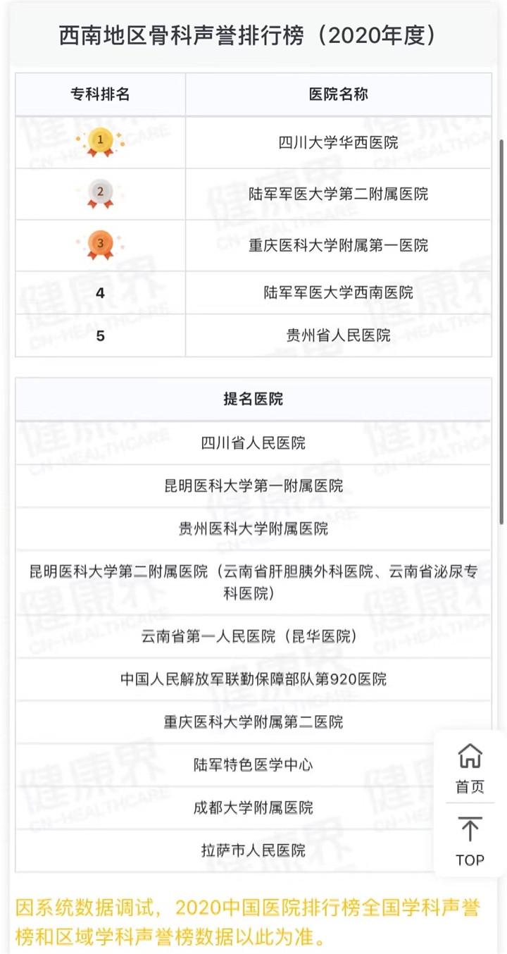 日前,在健康界举行的2020年度中国医院排行榜发布会上,对“西南地区骨科声誉排行榜(2020年度)”进行了公布,榜单上